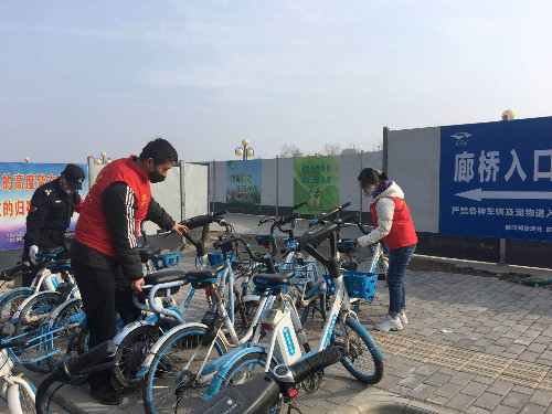 志愿者協(xié)助保安對廊橋引橋主口、西口的共享單車進行規(guī)范擺放