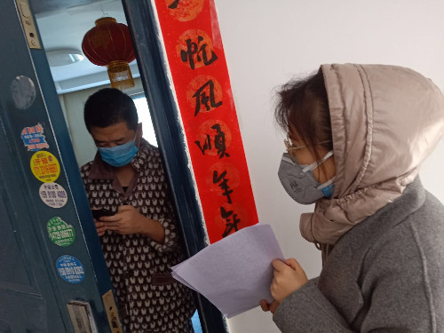 志愿者配合小區(qū)物業(yè)上門完成業(yè)主信息填報工作
