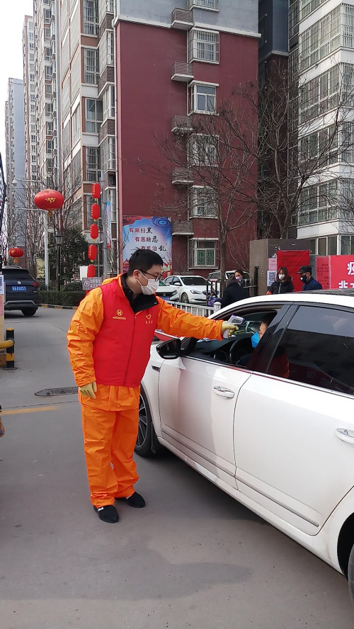志愿者對進入小區(qū)車輛上的司乘人員進行測溫